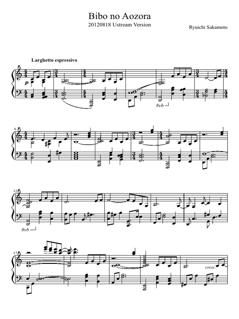 Get Bibo No Aozora Piano Sheet Music Images. Bibo noaozora music from the movie babel. Download and print in pdf or midi free sheet music for bibo no aozora by sakamoto, ryuichi arranged by saiougauma for piano, violin, cello (mixed trio).